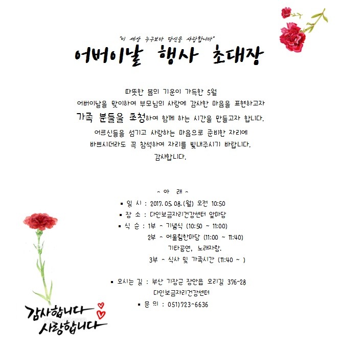 라는 뜻의 『 god could not be everywhere and therefore he made mothers.』라는 문구를 끝으로 어버이날 영어문구 마치겠습니다. 어버이날 인사말 (부모님께 드리는 축하 문구) (0) 2020.05.06: 8일 어버이날 맞아 sns에서 담백·감동·애교 등 다양한 문구 인기 /사진=이미지투데이 오늘(8일) 어버이날을 맞이해 부모님에게 제대로 진심을 전하고 싶은 이들이 적지 않다. 어버이날 말로 하기 쑥스러운 이야기를 프사, 카드로 쓸 수 있게 이미지로 만들어보았어요! 5 월이 다가오면 즐거운 가정행사들이 많이 기다리고 있습니다.